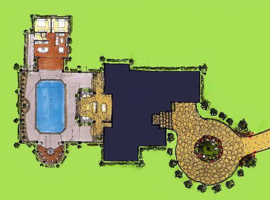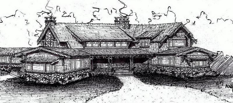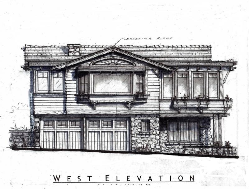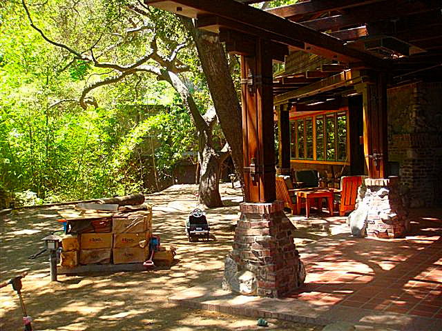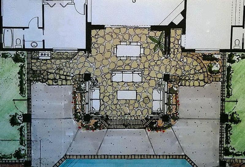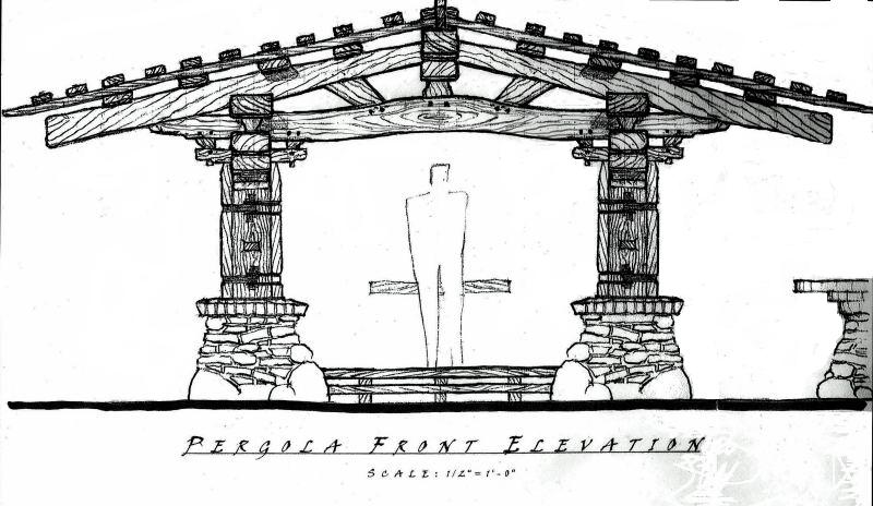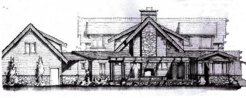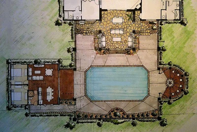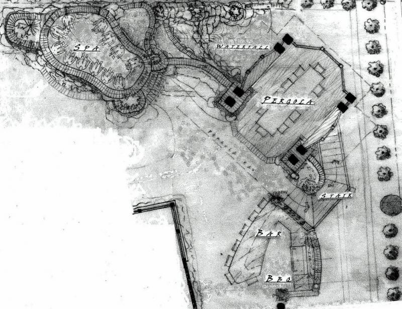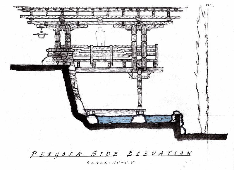 Schematic design in Rustic Canyon for a Greene & Greene style pergola, fountain, spa, waterfall, outdoor kitchen & lower deck over koi pond