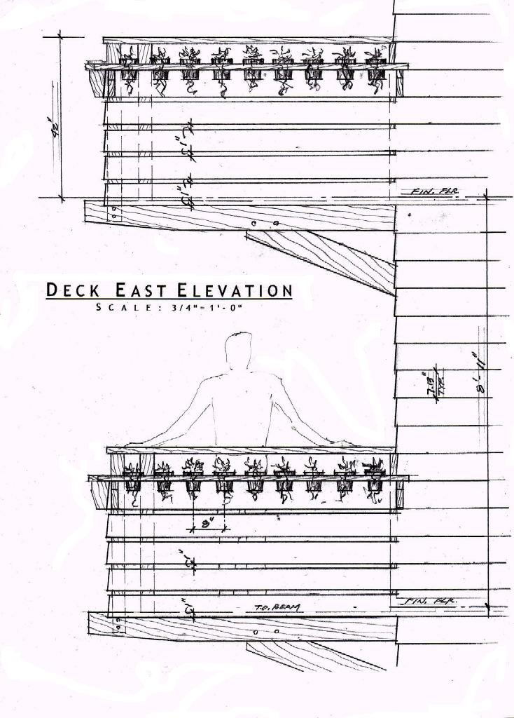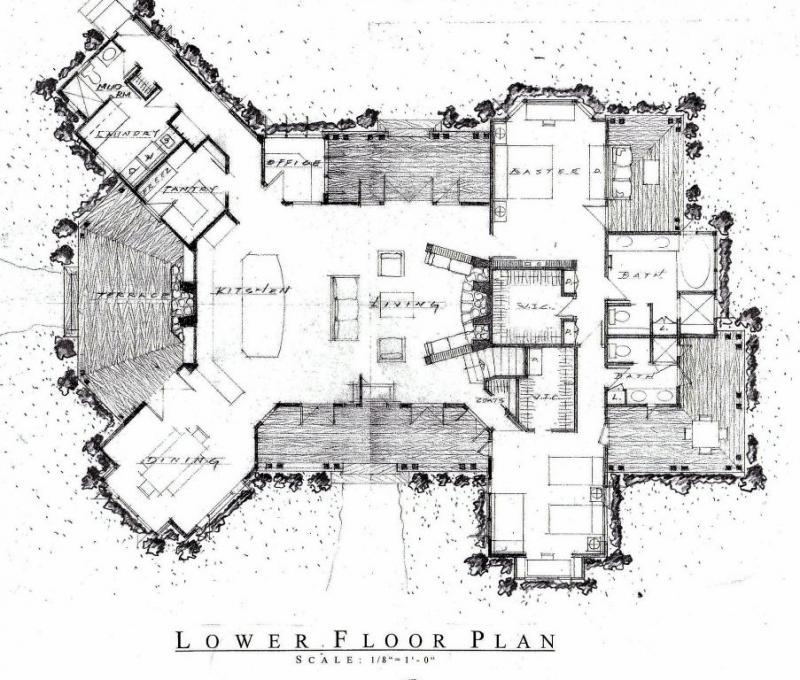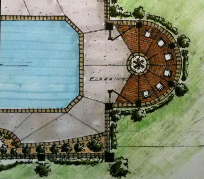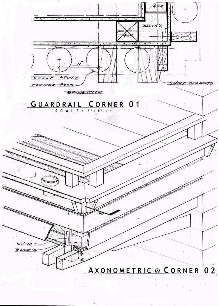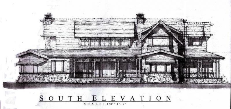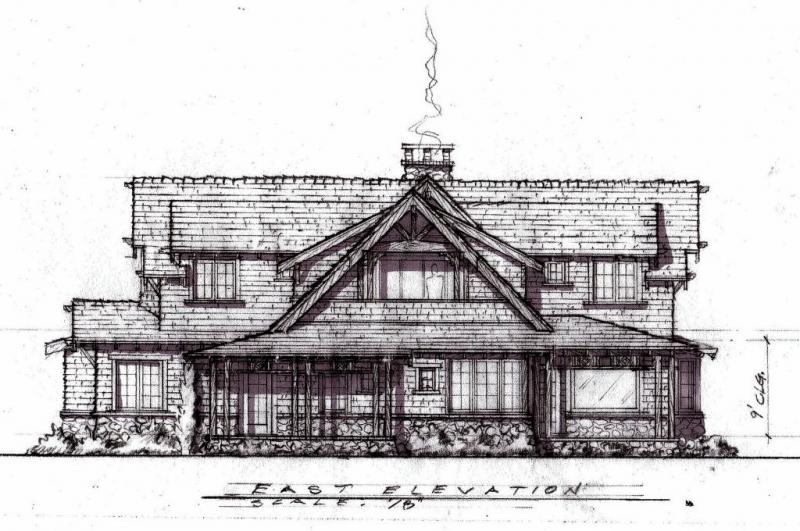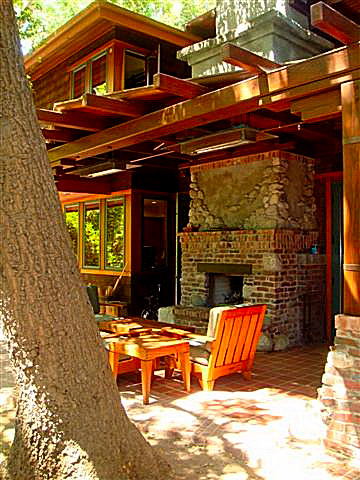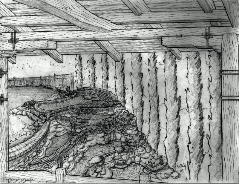 Schematic design in Rustic Canyon for a Greene & Greene style pergola, fountain, spa, waterfall, outdoor kitchen & lower deck over koi pond